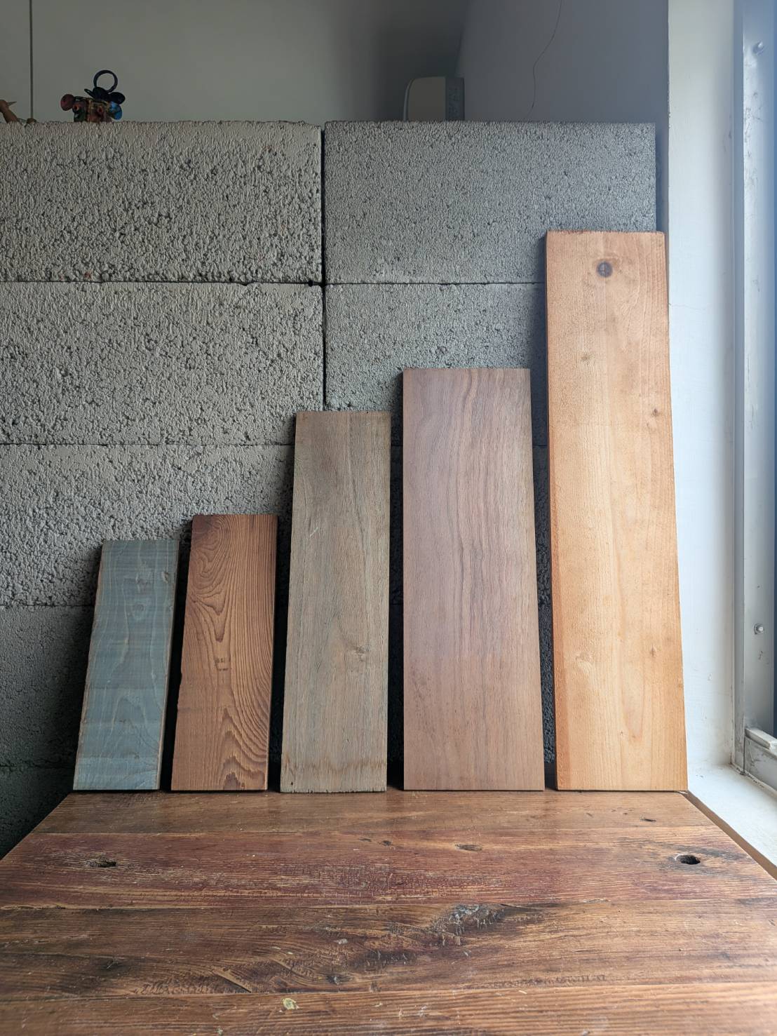 建物木料為80年前台灣木結構建物所拆,外露面因接觸空氣與日曬,漸漸自然氧化變成較深的顏色,非染色,其他面因經過裁切,露出木材本色。